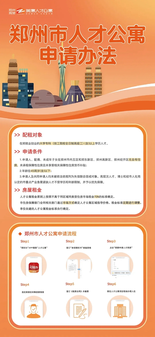 本批次配租全流程通過線上進(jìn)行,按照“一網(wǎng)通辦、一網(wǎng)通管”的原則,申請人可登錄“鄭好辦”APP(“一件事專區(qū)”→“住房保障一件事”),進(jìn)入人才公寓配租模塊,按照提示進(jìn)行申請、選房、簽約和退出。